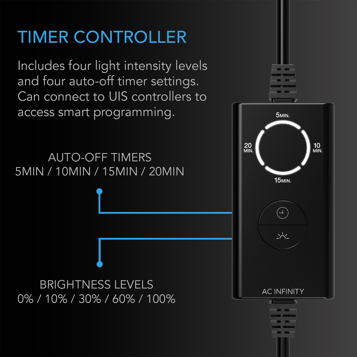 - Controller Compatibility: Integrates with UIS-compatible controllers via the AC Infinity app over WiFi. For automated scheduling alongside fans, environmental controllers, and other UIS devices, a UIS hub or compatible controller is required.