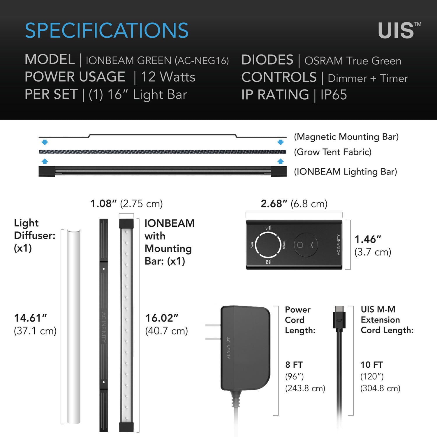 The included Dimming Timer Controller (3.31 x 1.26 in. / 8.4 x 3.2 cm) provides four discrete intensity levels, allowing operators to dial output to the minimum necessary for the task at hand. Auto-off programming in 5, 10, 15, and 20-minute increments eliminates the risk of a fixture being left on past its intended window — a critical safeguard in facilities where a single uncontrolled dark-cycle interruption can delay an entire harvest cycle. The detachable diffuser softens the 525 nm output and distributes it more evenly across the coverage footprint, reducing hot-spot intensity directly beneath the bar. The unibody bar measures 16.02 x 1.08 in. (40.7 x 2.75 cm), mounts magnetically to tent frames and bar-style fixtures, and carries an IP65 rating for operation in high-humidity sealed environments with operating temperatures from 32 to 140°F. UIS platform integration connects the AC-NEG16 to the AC Infinity app over WiFi, enabling scheduled automated deployment alongside fans, controllers, and other ecosystem components. The 8 ft. (96 in.) power cord accommodates standard rack and tent mounting configurations without extension requirements. In practical terms, the AC-NEG16 delivers 525 nm green illumination at 12W / 2.0A across up to 10x10 ft cultivation spaces with automated timer shutoff and four-level dimming, rated for 50,000 hours of continuous operation in IP65-certified humid environments.