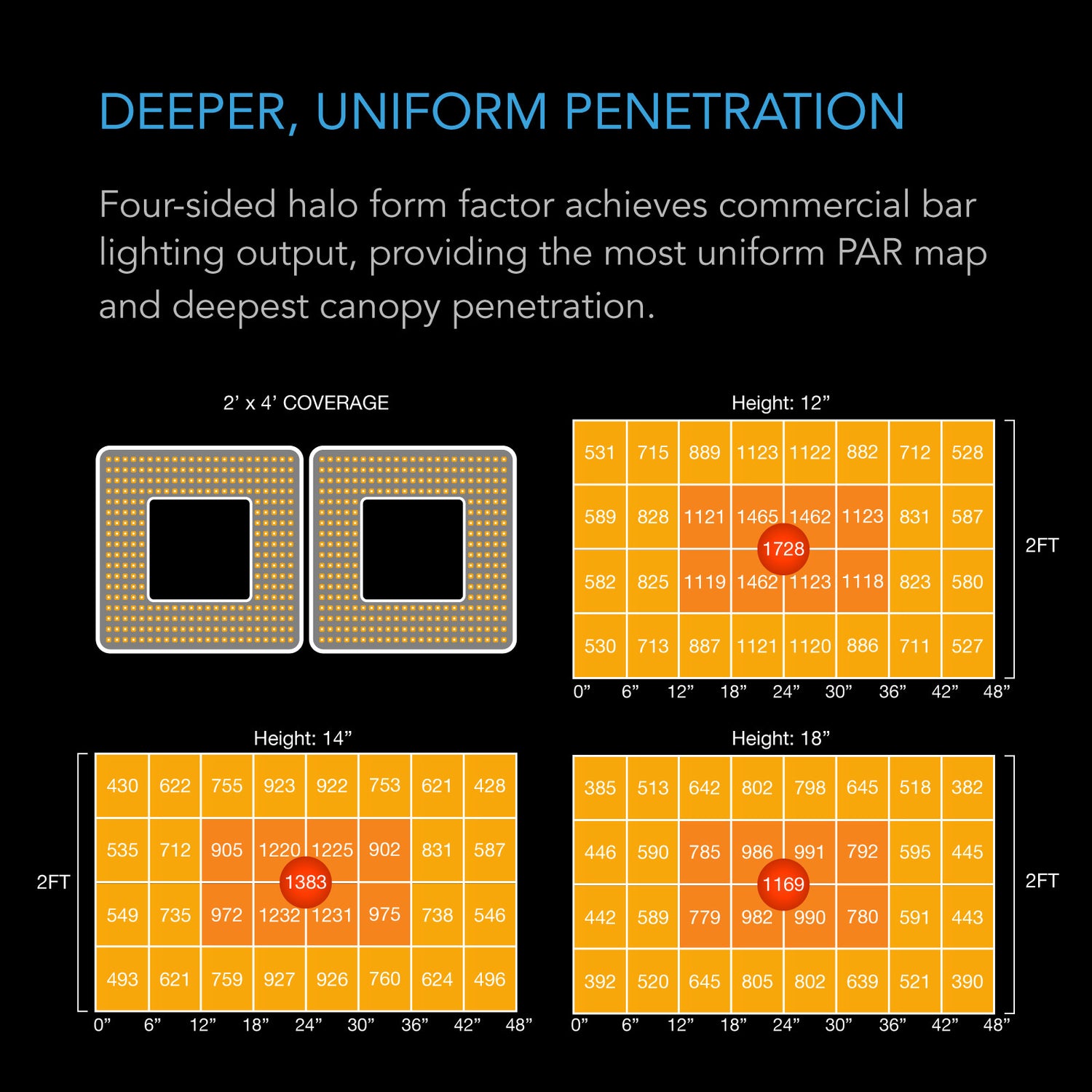 - Outcome: Uniform 1728 PPFD across a 2 x 4 ft. canopy at 2.75 µmol/J efficacy, with programmable PWM dimming (0–100%) and automated schedule control via the included Digital Transition Controller.